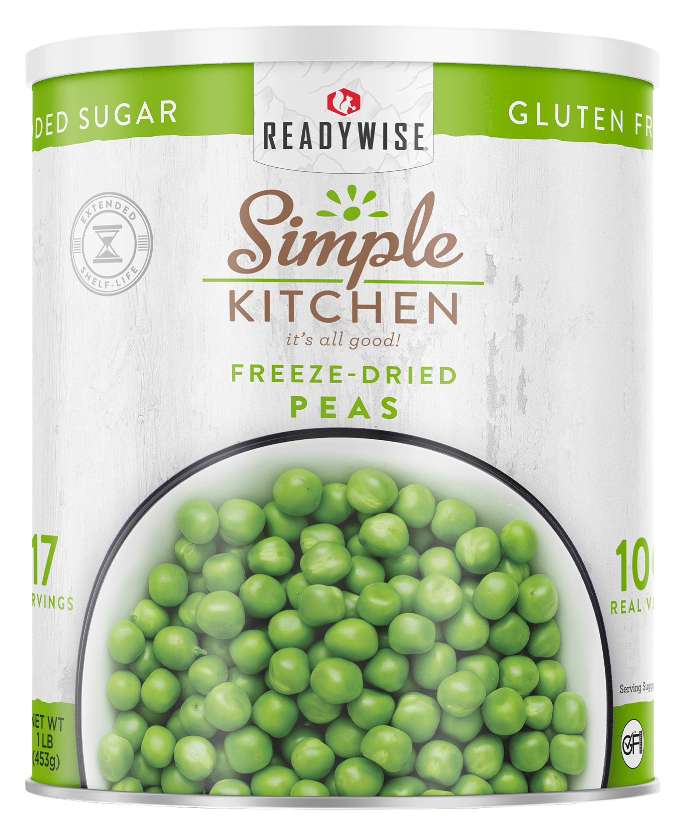 The ReadyWise® Simple Kitchen #10-Can Freeze-Dried Peas can be eaten as they are or rehydrated with water. Each can contains 17 servings, with each serving providing 90 calories and 5 grams of protein. The ReadyWise Simple Kitchen freeze-dried peas are gluten free. Extended shelf life.